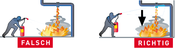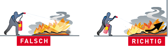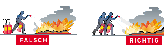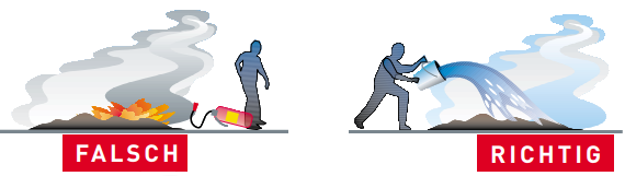 Bei Feuerlöschern ähnlich dem abgebildeten Modell, sind mehrere Schritte notwendig um mit dem Löschen zu beginnen.