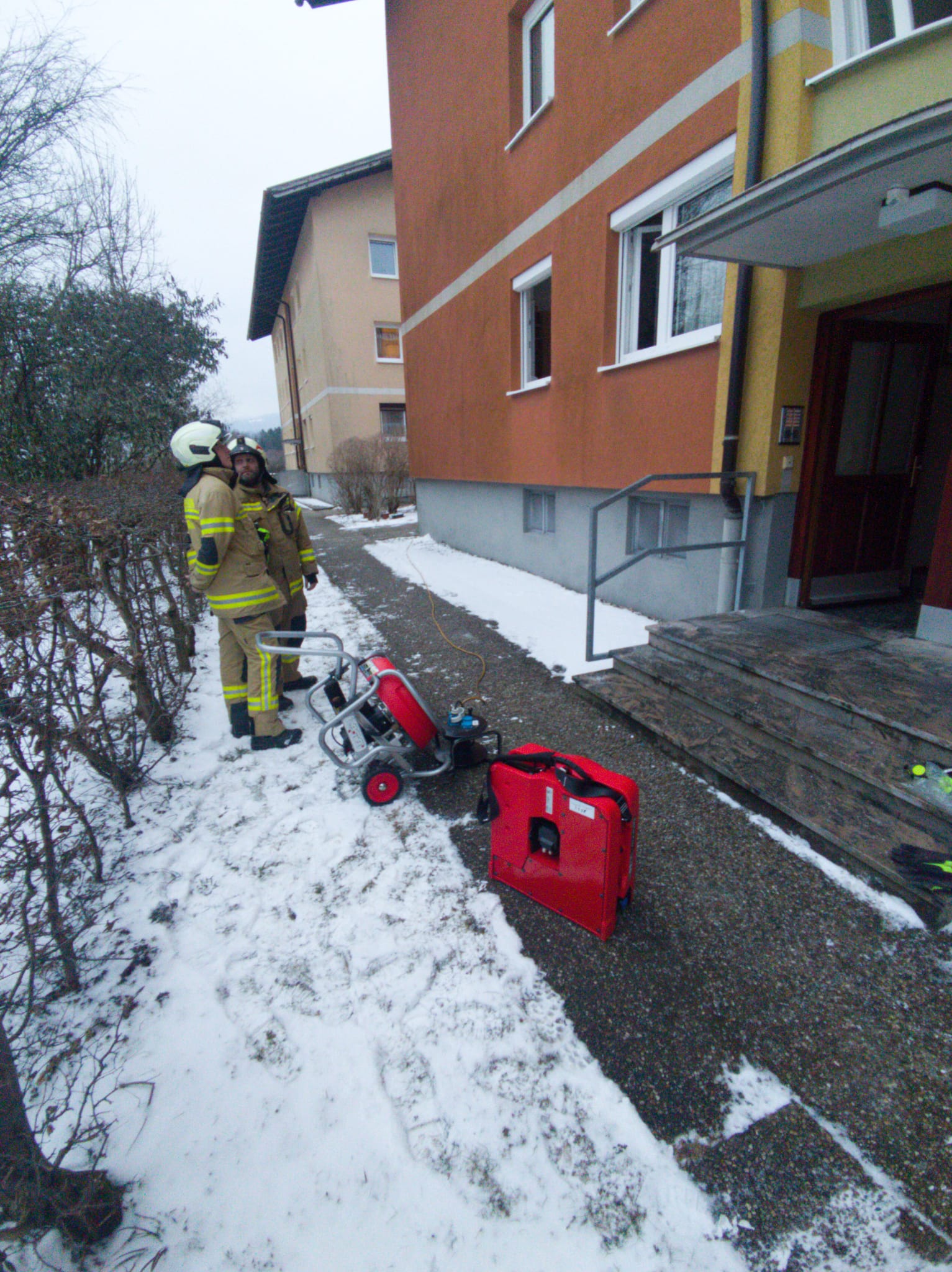 Beim Eintreffen der Feuerwehr wurden Gasmessungen durchgeführt, um die Gefahrensituation einzuschätzen. Aufgrund erhöhter Werte wurde das Gebäude mit Überdrucklüftern belüftet, und eine Evakuierung des gesamten Wohnblocks war erforderlich. Auf Befehl des Einsatzleiter wurde der Löschzug Fürstenbrunn nachalarmiert. Das gesamte Gebäude wurde durch Atemschutztrupps durchsucht, um sicherzustellen, dass sich keine Personen mehr in den Wohnungen aufhielten. Für die evakuierten Bewohner wurde in der Zwischenzeit im Feuerwehrhaus ein Sammelraum eingerichtet, in dem sie betreut wurden.